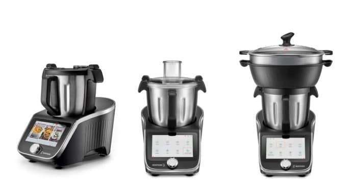 Véritable assistant culinaire tout-en-un, ce robot cuiseur connecté est une bête de compétition avec sa large panoplie d’accessoires : 2 grands paniers vapeur dont un en inox, 1 petit panier vapeur inox, 1 disque inox réversible pour couper et râper, un disque pour râper le parmesan/chocolat, 1 fouet, 1 couteau 4 lames pour broyer/hacher, 1 pale de mélange et brassage, 3 couvercles dont 1 en verre, 1 bouchon doseur et 1 spatule ! Avec sa cuve à poignée d’une grande capacité (4,5L, dont 3 L de volume utile) et sa balance intégrée pour peser au gramme près, il permettra de cuire, saisir, mijoter, bouillir, cuire à la vapeur, mélanger, pétrir, émulsionner, hacher, mixer et même râper/trancher ! Son écran tactile 7 pouces aidera au suivi des 500 recettes intégrées en pas à pas, pour réussir avec succès n’importe quelle préparation. Grâce à sa connectivité, 200 recettes complémentaires téléchargeables seront disponibles d’ici la fin de l’année pour élargir son champ d’exploration culinaire. Aucune idée pour le prochain repas ? Il suffit de rentrer le nom d’un ingrédient disponible dans le réfrigérateur dans la barre de recherche et l’appareil sélectionnera des suggestions de recettes contenant cet aliment !