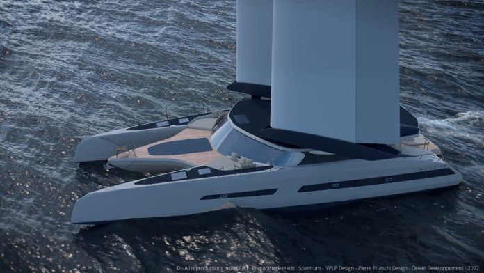 Ce nouveau catamaran de 70’ est le premier navire combinant 2 systèmes de propulsion automatisés : aile gonflable sur mât rétractable et moteur électrique avec système d’hydrogénération à pas variable.