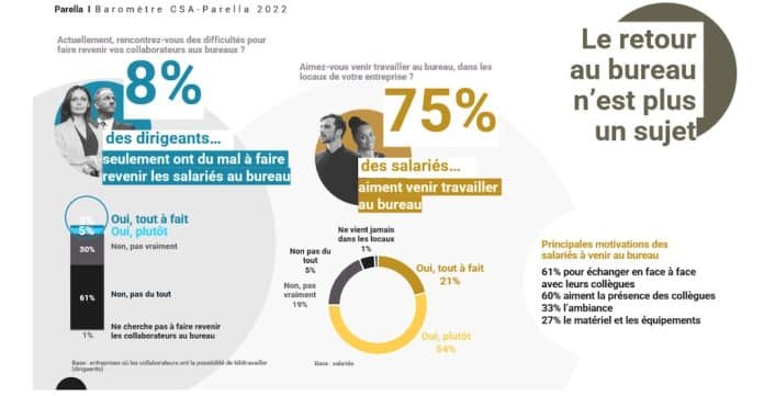 8% seulement des dirigeants disent avoir du mal à faire revenir leurs collaborateurs au bureau. Un chiffre conforté par 75% des salariés qui ont plaisir à revenir sur leur lieu de travail, principalement pour y voir et échanger avec leurs collègues.